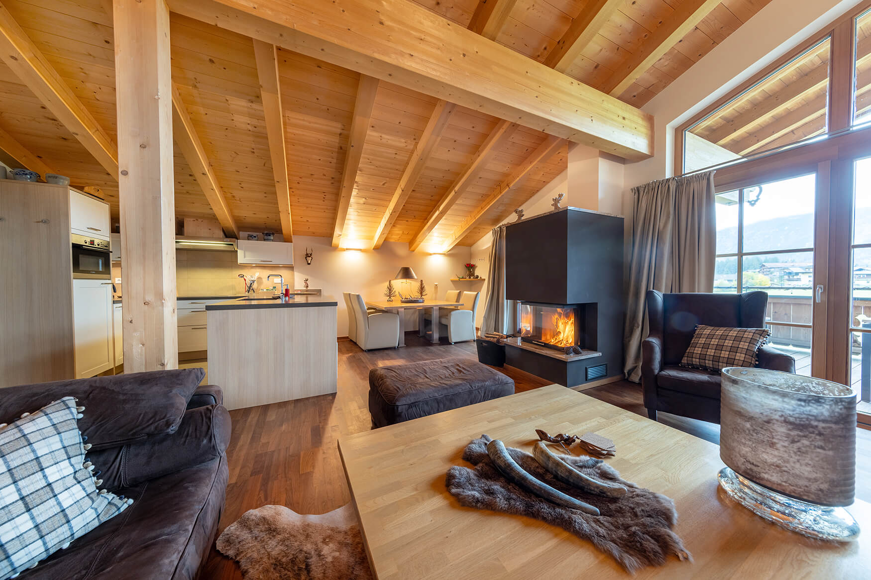 Ein offener Kamin sowie ein großer Balkon oder großzügige Terrasse mit herrlichem Berg-Panorama laden zum Genießen ein. Alle Wohnungen verfügen über eine vollausgestattete moderne Wohnküche sowie Flat-TV mit Kabel-TV und Möglichkeit zu Streamingdiensten sowie gratis W-Lan und lassen Sie vom ersten Moment an wohlfühlen. Das Haus ist außerdem mit Skistall / Stiefeltrockner und einem Personenlift ausgestattet.
